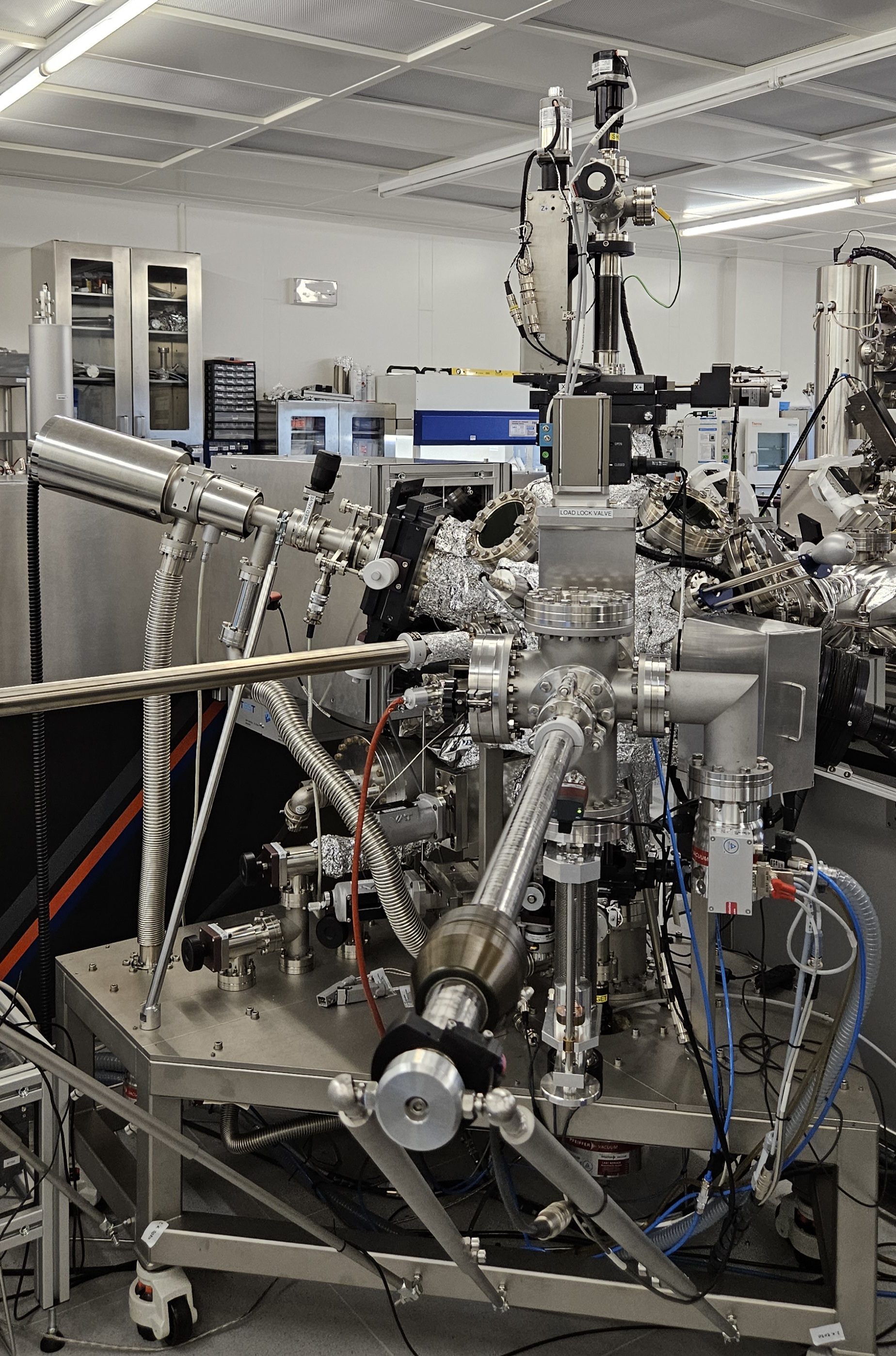 Pulsed laser deposition (PLD) is a vacuum deposition using ablation of a target material with a pulsed ultraviolet laser. This technique is most often used for deposition of oxides, for example transition metal oxides; however, metals can be deposited as well. The highlight of this technique is the in-situ monitoring of sample growth with reflection high energy electron diffraction (RHEED) that in principle enables to monitor and control the grown on monolayer scale. The PLD chamber is attached to the UHV cluster and thus the PLD grown samples can be analyzed within the cluster or additional materials can be deposited on the same substrate.Publications